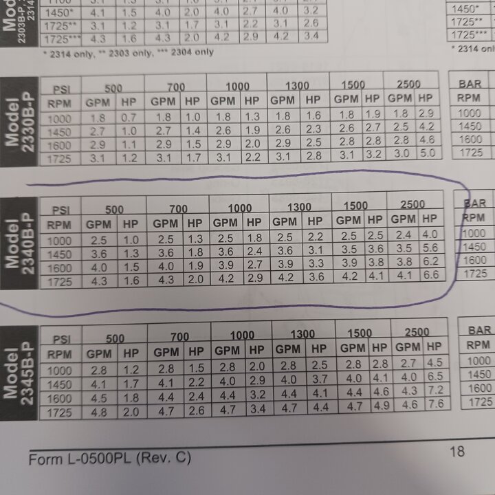 Yes thats what im saying . But only if your jets are allowing LESS THAN YOUR PUMP OUTPUT IS youll spray the same amount of water ei: if your pumps flow is 2gpm@ 400 psi and your jets are 1.5gpm @ 400psi the flow would be the same even on a pump that did 15 or 20 gpm. However if the pump does 2gpm@400psi and your jets use2.25gpm@400psi there would be a severe pressure drop on that pump but would maintain pressure on the pump that produces 4gpm. Keep in mind pumps are rated @rpms ie: if your pump is rated @ 2gpm@2500psi@1750 pump rpm if the pump turns less rpms the gpm and psi will be lower. Below is the performance chart for my pump, Hypro 2340b-p
