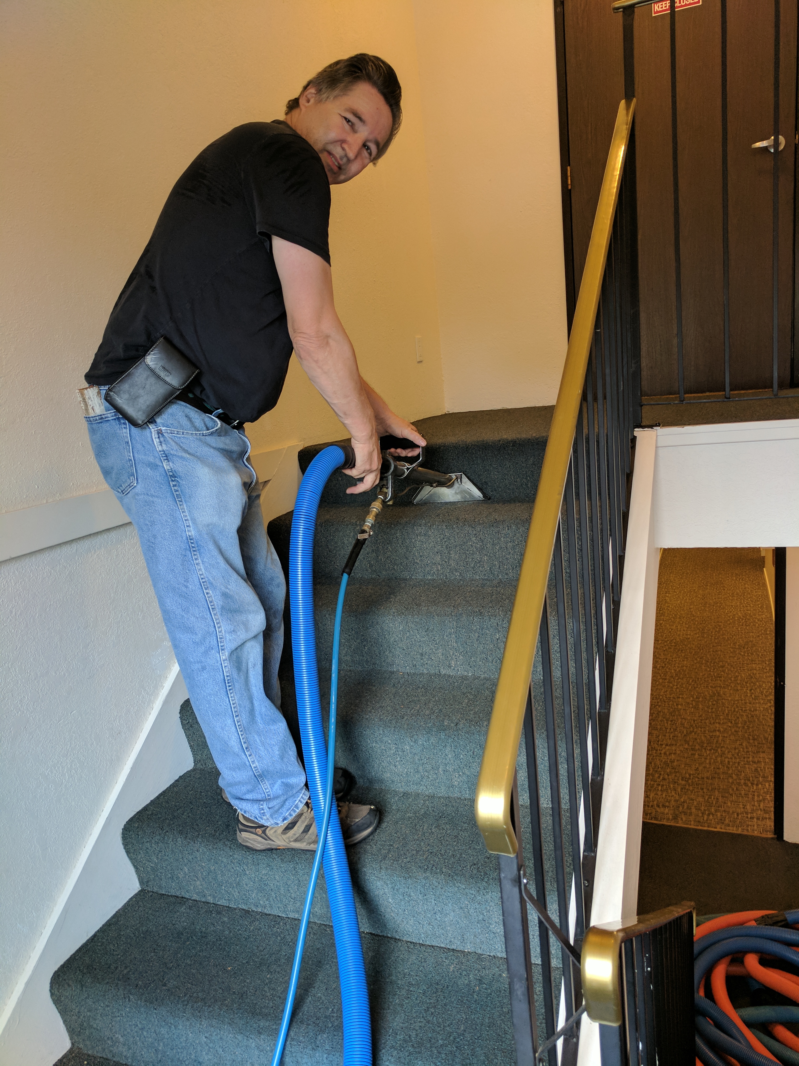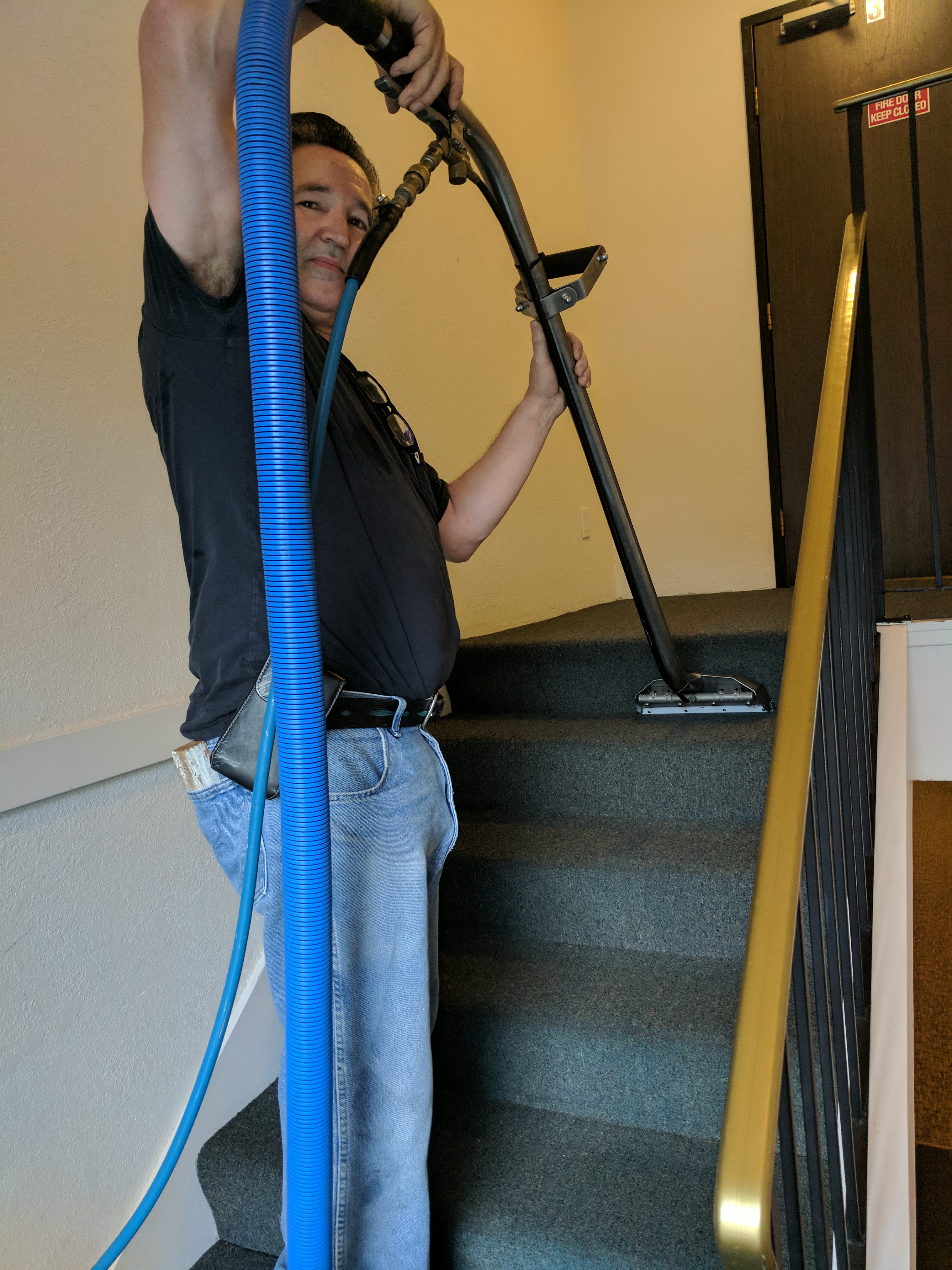 I'm not saying you can't use your wand on stairs, in fact, in the building in my picture, I cleaned the last 6 stairs at each end of the ground floor hallway with the wand. It's a straight shot and not too uncomfortable. On the upper staircases, it's steep and not a lot of room to maneuver especially between the last 2 stairs and the landing wall. You would have to turn a full size wand sideways to get the last 2 stairs. If you only do a few stairs once in a while and want to use your wand, go for it. If you live in the land of stairs, you're better off finding a stair tool that works for you. Power washers have the same issue. If they are always using the lance in large jobs, rather than a spinner, they have to hold their shoulder high for an extended period of time and risk doing damage to their rotator cuff. Today, I cleaned 96 stairs. I am thankful for my stair tool.